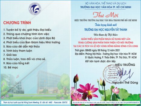 Trường Đại học Văn hóa TP. Hồ Chí Minh tổ chức Hội thảo khoa học “Giảm thiểu sản phẩm nhựa sử dụng một lần, tăng cường sản phẩm thân thiện với môi trường tại các di tích và lễ hội vùng Đồng bằng sông Cửu Long” vào thứ Tư ngày 08/ 12/2021.